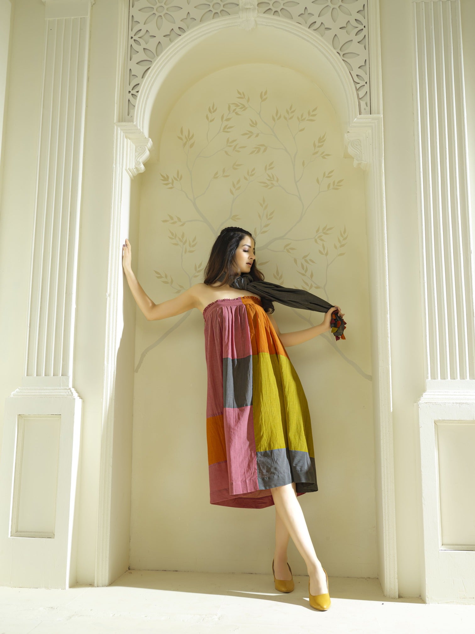 This piece of clothing is made using Pure Bamboo Fabric, a premium sustainable textile that offers a cooling, silky touch against the skin. It features a fluid, architectural silhouette in a knee-length cut, starting with a refined straight-across gathered neckline that creates a chic, strapless aesthetic. The dress is meticulously crafted with patchwork color-blocking, joining bold rectangular panels of rose pink, mustard, and charcoal. This sophisticated construction ensures the voluminous drape flows effortlessly, paired with a matching charcoal stole for a complete, high-fashion look.