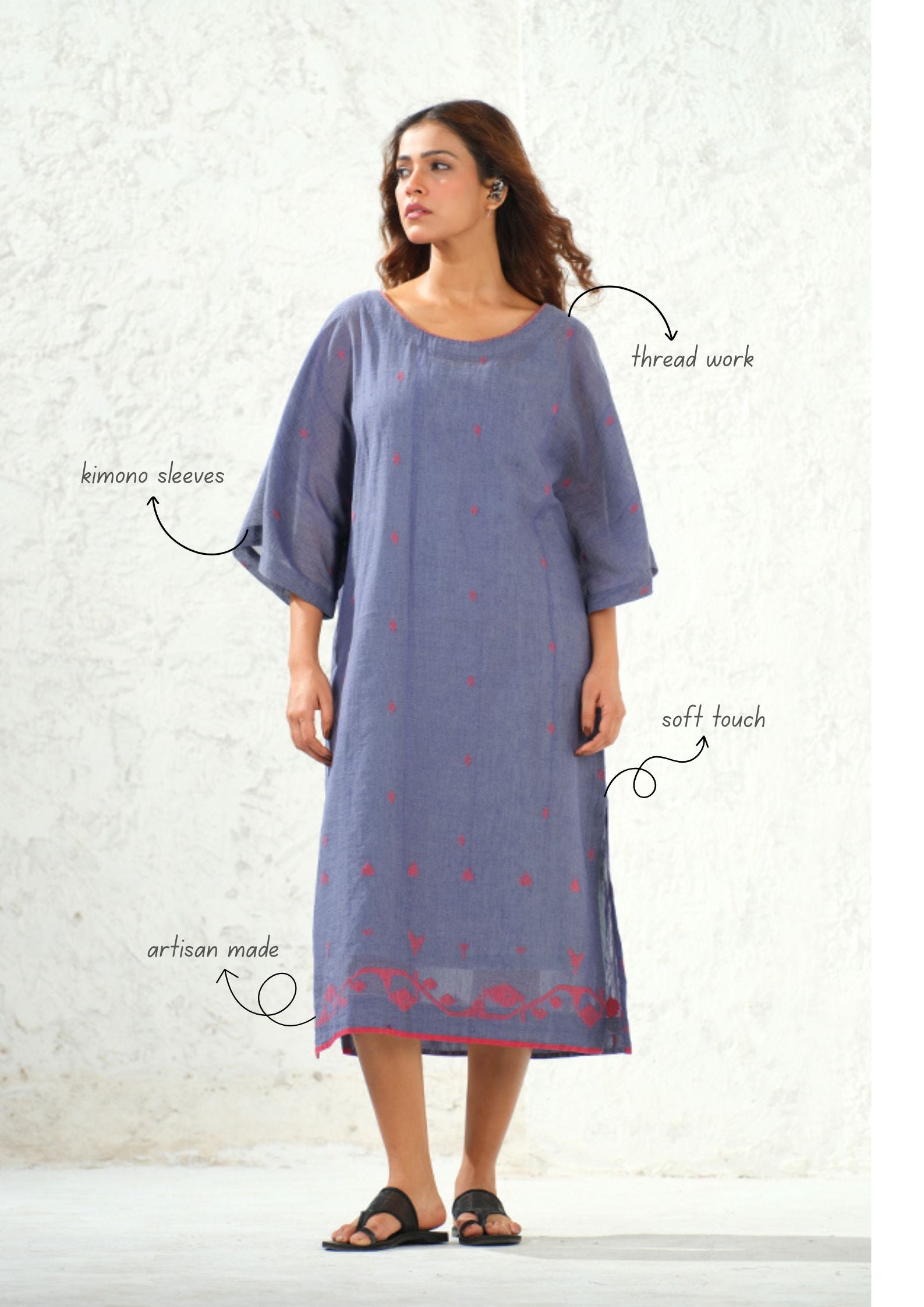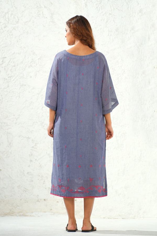 Meaningful Fashion for Mindful People Embrace a blend of architectural ease and heritage craft with this Kimono-style kurta with Jamdani Craft, hand-woven from soft Organic Cotton. The silhouette features a modest round neckline and dramatic, wide-cut kimono sleeves finished with a contrast binding and comes with slip. A scattering of delicate red Jamdani buttis across the indigo base leads the eye to an intricate, hand-woven floral Daman, making it a timeless choice for mindful living.