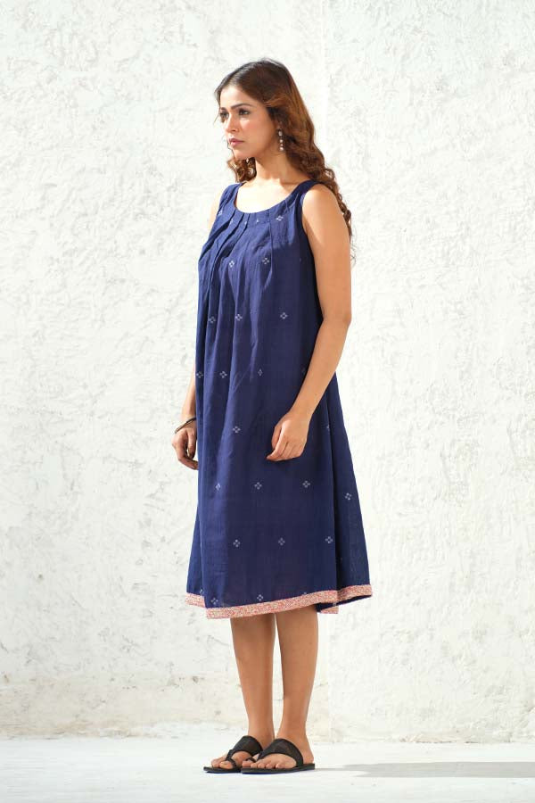 Meaningful Fashion for Mindful People A graceful blend of contemporary structure and traditional artistry, this dress is Hand-Woven from breathable Organic Cotton. It features a sophisticated pleated halter neckline that flows into a relaxed, airy silhouette adorned with delicate Jamdani Craft. Finished with a subtle contrast border at the hem, this piece offers a timeless, sleeveless design perfect for effortless day-to-evening transitions.