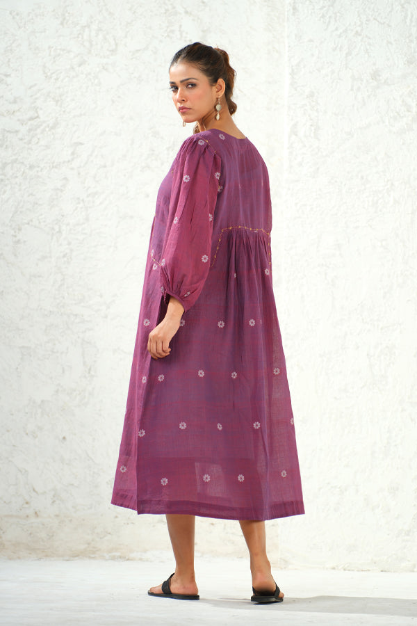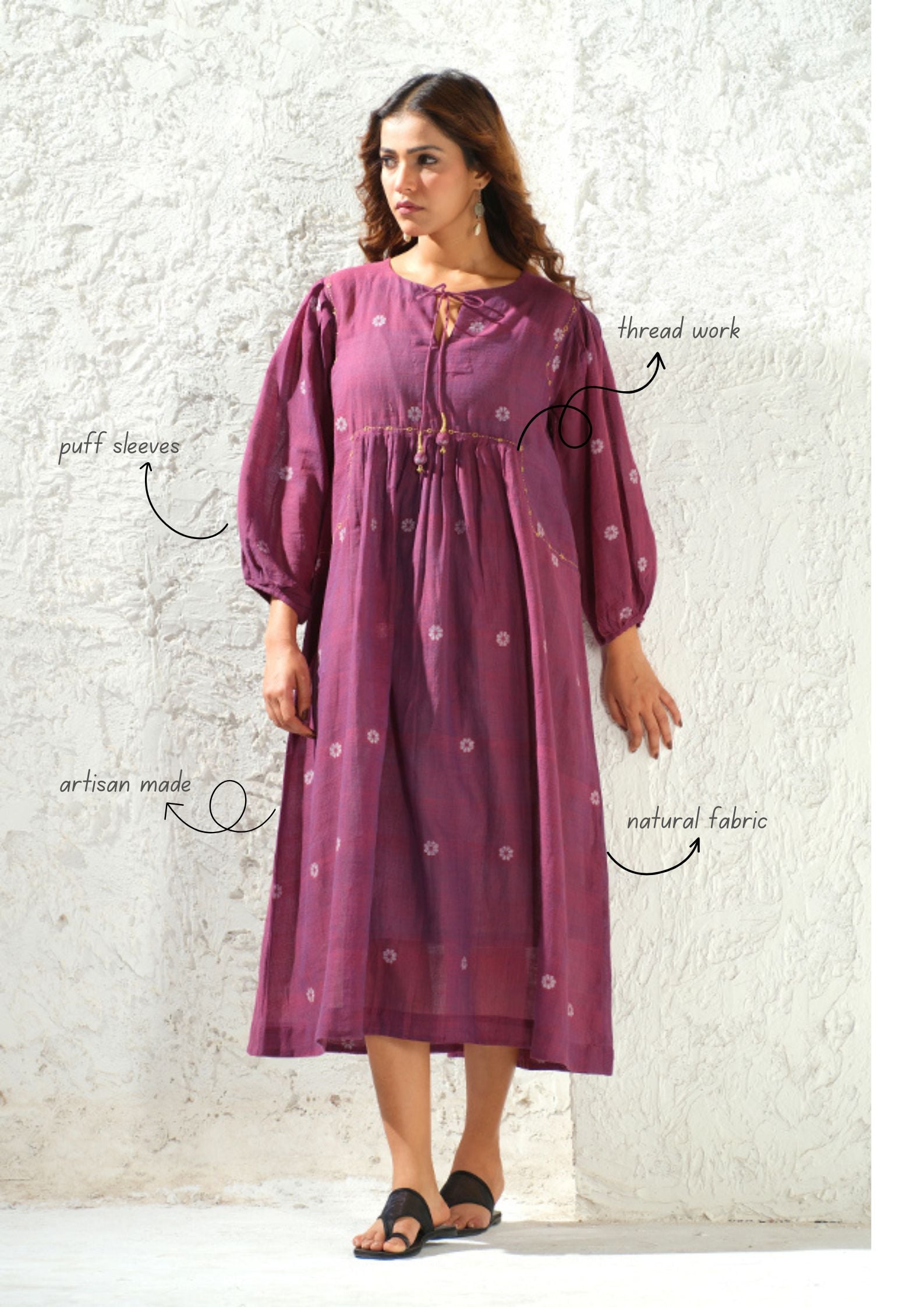 Meaningful Fashion for Mindful People Experience a soulful blend of color and Jamdani Craft with this tiered dress, hand-woven from premium Organic Cotton. The silhouette features a delicate tie-up detail and voluminous lantern sleeves that gather at the wrist and also comes with slip. Adorned with scattered white Jamdani floral buttis and an intricate hand-woven yoke, this plum-hued piece offers a graceful, flowing movement designed for effortless elegance.